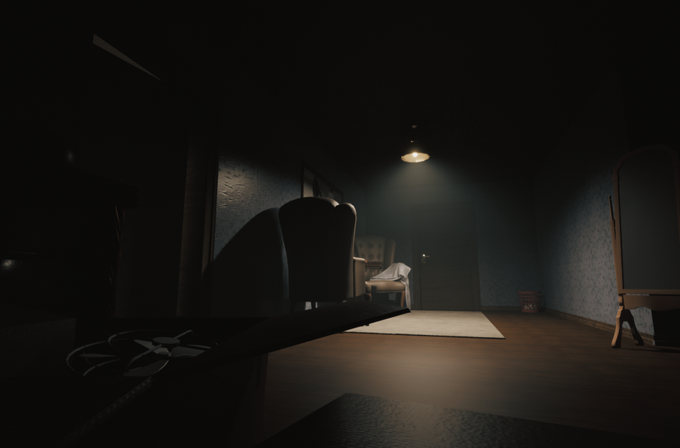 Designing the hallway was challenging as it sets the mansions mood. I used level design techniques like leading lines which i used with lighting and strategic object placement, such as a fallen lamp near a drawer with a letter, to guide players to the locked basement door while maintaining their interest. I designed the space to encourage exploration for the player to feel a reward after they discovered new spaces.